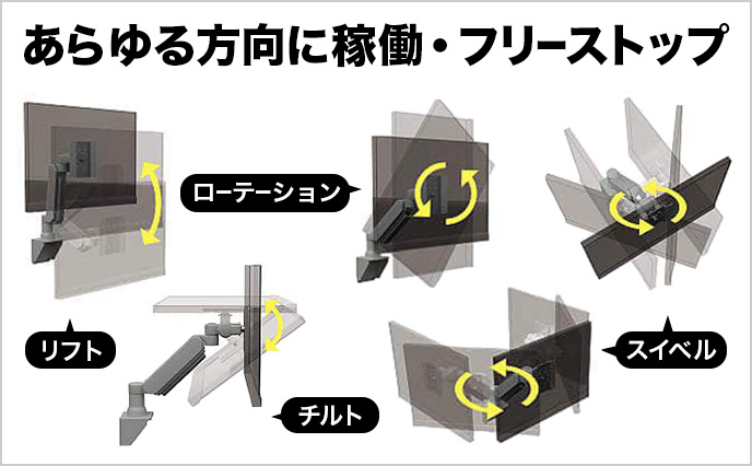 モニターをあらゆる方向に可動・フリーストップするモニターアームや、モニターの角度を上下左右に調整できる2軸アシストルクヒンジなど、医療現場でのモニターの角度調整に最適な製品をバリエーション豊富にご紹介します。