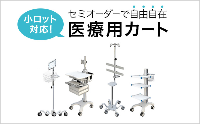 本体と60種類を超えるオプションの組み合わせによって、ナースカートや心電計カートなど、用途に適したセミオーダーのカートを作ることができます。1台からの小ロット対応可能。板金加工も承ります。