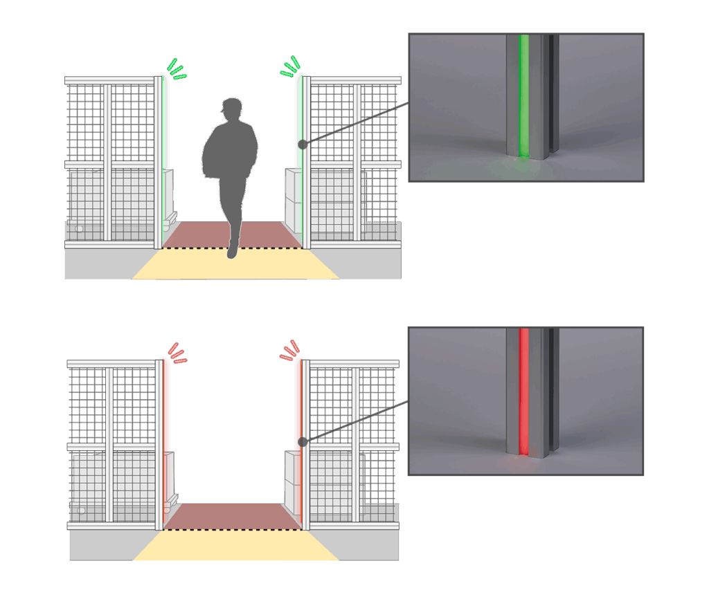 作業者がボタンを押すと、赤外線センサーがOFFになり、LEDが「緑」に点灯。通行後に再びボタンを押すことで、センサーがON、LEDは「赤」に戻ります。
