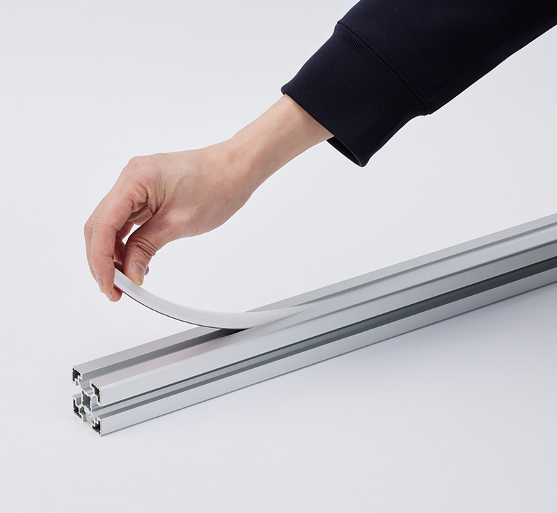 この製品は、溝幅10mmのアルミフレームにぴったり納まり、スマートな形で通行者の視界に入るよう設計・設置いただけます。